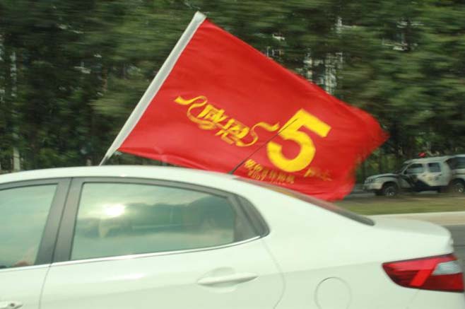 我們總經(jīng)理的車子使在前方,“高臻智能感恩五周年”的旗子高掛。