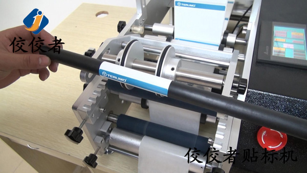 上圖展示的是工作人員將需要貼標(biāo)的PE管放在方便拿取的位置以增加貼標(biāo)的效率,此時有一個步驟在圖片中沒有展示出來,那就是接通電源之后需要做的就是將PE管放在包膠軸與覆標(biāo)海綿軸待貼位置,可根據(jù)產(chǎn)品直徑的大小進(jìn)行調(diào)整,然后踩腳踏,此時貼標(biāo)過程已經(jīng)完成.看似只有一秒鐘的時間,在這個時間中,機(jī)器進(jìn)行了一系列的工作。當(dāng)腳踩發(fā)出信號,電機(jī)轉(zhuǎn)動帶動PE管轉(zhuǎn)動,并送出標(biāo)簽到PE管上,一邊出標(biāo)一邊覆標(biāo).至此,貼標(biāo)過程就已經(jīng)完成了。(操作過程:放產(chǎn)品—>貼標(biāo)并覆標(biāo)(設(shè)備自動實(shí)現(xiàn))—>取出已貼標(biāo)產(chǎn)品。)如下圖: