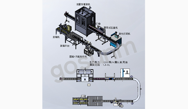 整線說明:灌裝食用油1.5-5L,生產(chǎn)能力1200桶/H(相對(duì)5L)