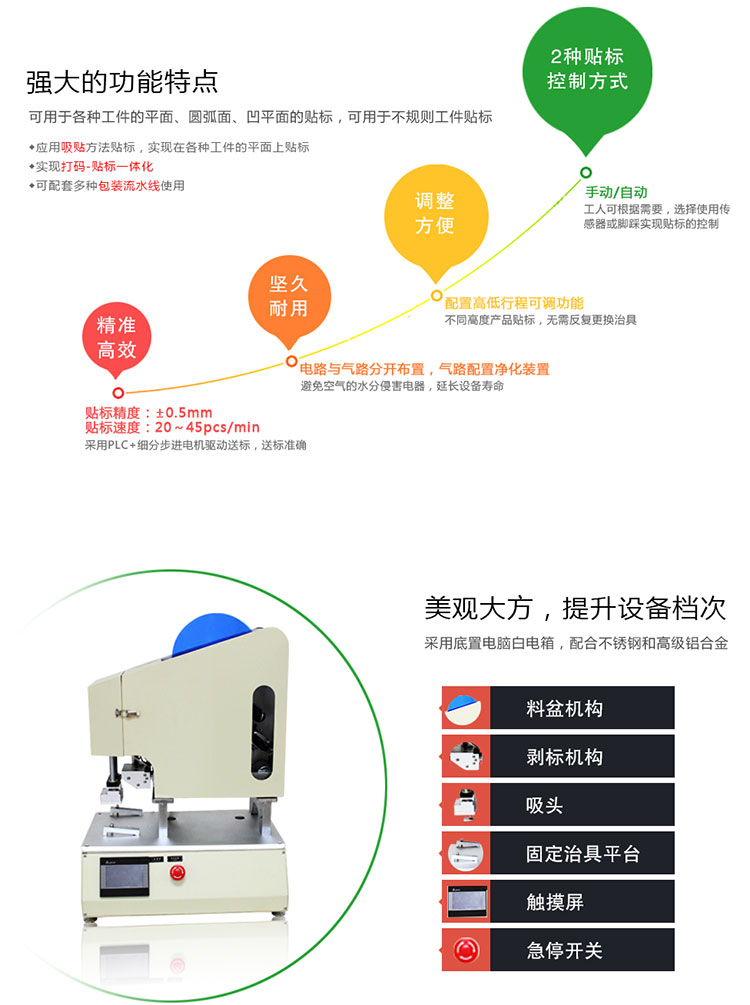 半自動高精度平面貼標(biāo)機有著以下產(chǎn)品特點: