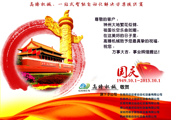 國(guó)慶節(jié)來(lái)臨之際,東莞市高臻智能自動(dòng)化設(shè)備有限公司祝大家假期愉快。 在國(guó)慶小長(zhǎng)假中高臻智能公司送上一份祝福:國(guó)慶節(jié)到了,黃金周來(lái)了,再忙也該歇歇了,心情變爽了,天氣變好了,也該出去走 走了,行李帶好了,朋友約少了,你能加入就更好了。祝大家前程似錦、健康快樂(lè)。_高臻智能貼標(biāo)機(jī)
